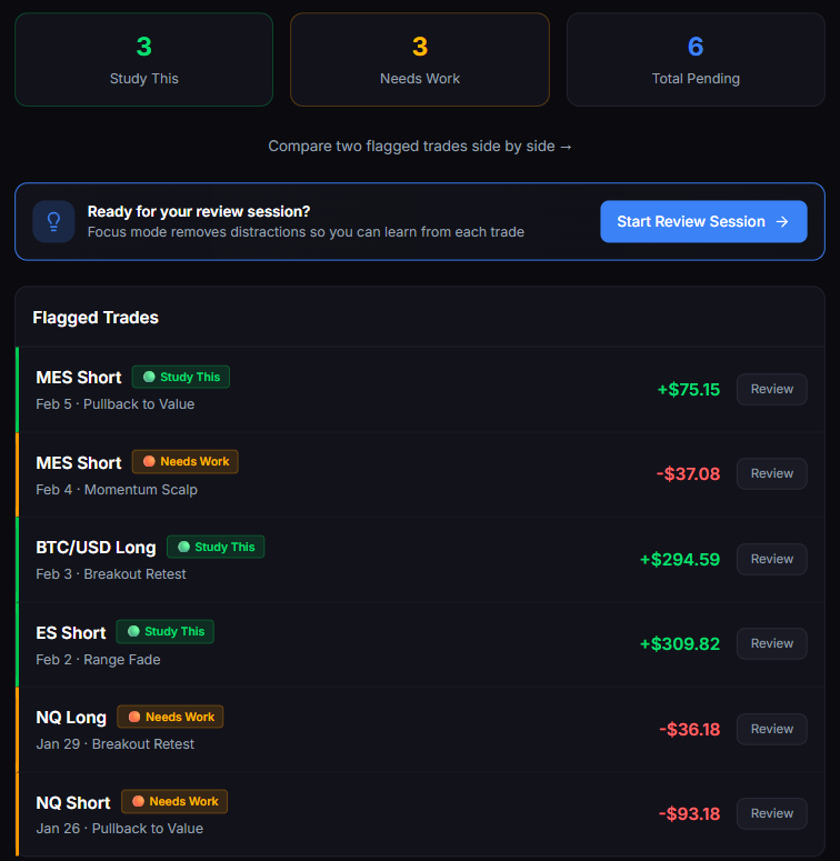 Most traders look at a trade once and move on. Flag the ones worth studying, review them with focused notes, and watch real patterns emerge. The traders who study themselves improve. The ones who don't repeat the same mistakes.