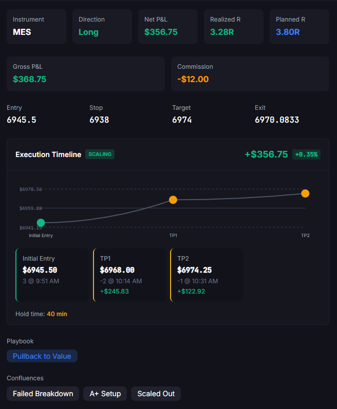 Log multiple entries and exits within a single trade. Weighted average prices, execution details, and a visual timeline that shows exactly how your trade unfolded from entry to exit.